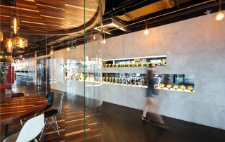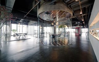 La trasparenza come tratto principale della composizione spaziale permette alla luce naturale di raggiungere gli angoli più profondi dell’ufficio e di introdurre una sensazione di semplicità, creatività e luminosa nuova vita. Le partizioni in vetro, alcune in forme rotonde sorprendenti, non sono solo un modo molto intelligente per illuminare l’ambiente lavorativo, ma anche un invito all’interazione comune, la condivisione e l’espressione artistica di dinamiche moderne. I pavimenti in cemento fanno parte del progetto di illuminazione riflettendo la luce e portando espressione urbana contemporanea all’ambiente.